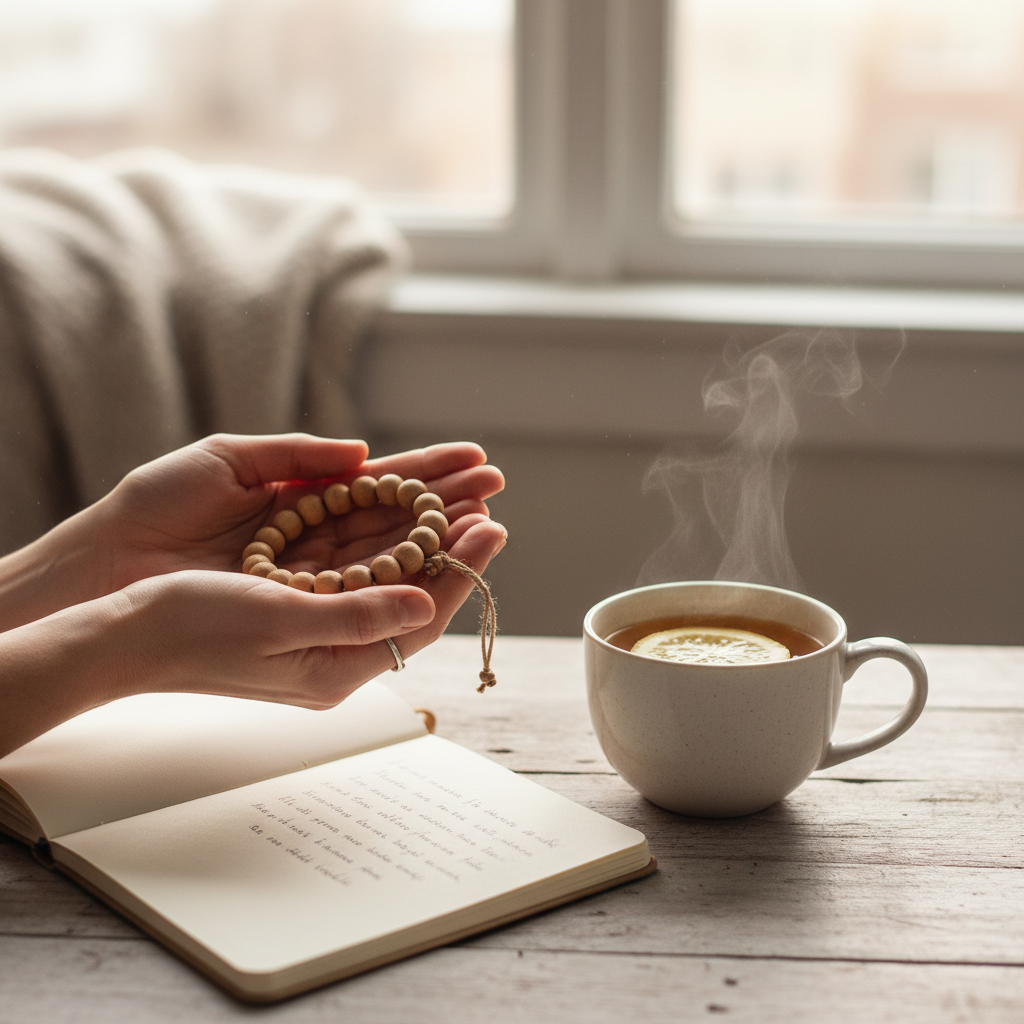 - 🧘 Soir (2 min) : gratitude, frottement des perles, pose sur la table de nuit.