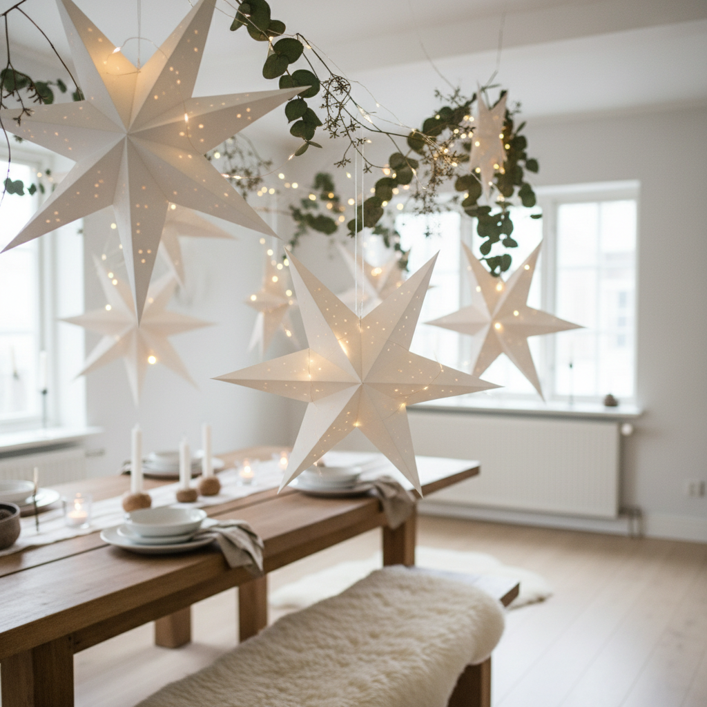 - ❄️ Nordique: étoiles papier blanc + eucalyptus + LED chaudes ➝ calme lumineux.