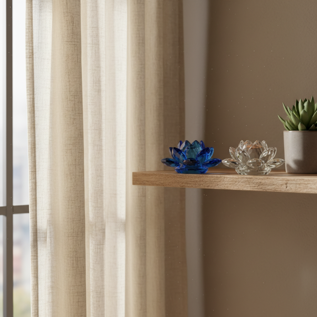 Dans une lecture Feng Shui, le lotus en cristal agit comme un prisme qui clarifie la circulation du Chi. Là où les angles vifs contractent, ses facettes arrondies apaisent; là où un couloir accélère, son éclat ralentit et recentre. Bien placé, il soutient la détente et le focus, sans jamais remplacer une bonne organisation de la pièce.