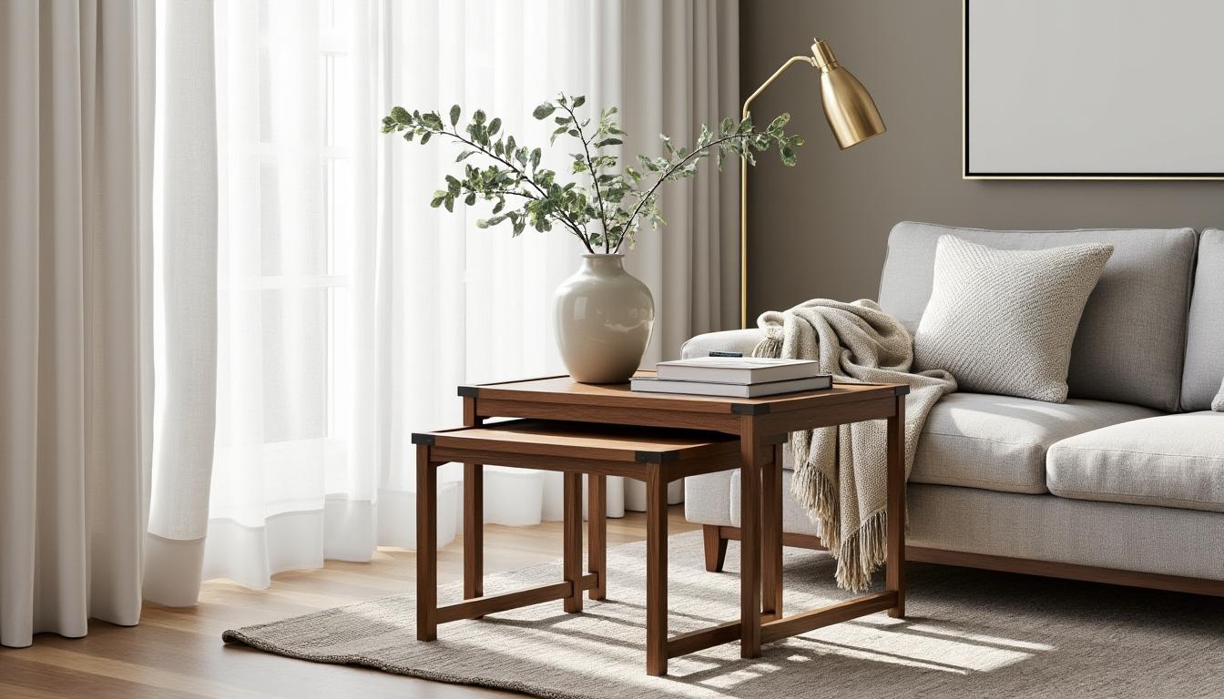 - 🛋️ Intégrez une table basse gigogne métal et bois dans un salon épuré, en accord avec des éléments végétaux et un tapis cosy pour un équilibre parfait.