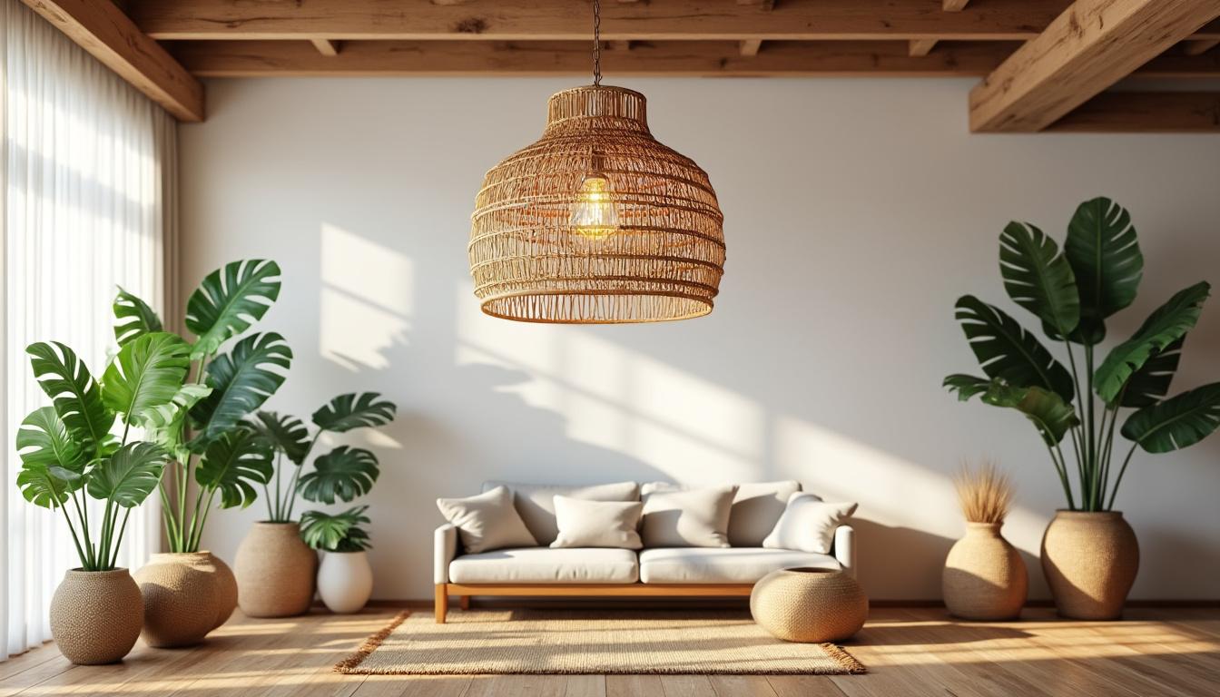 | Lustre suspendu en osier tressé | Léger, diffusion douce de la lumière | Salon, salle à manger | Boho, scandinave, naturel |