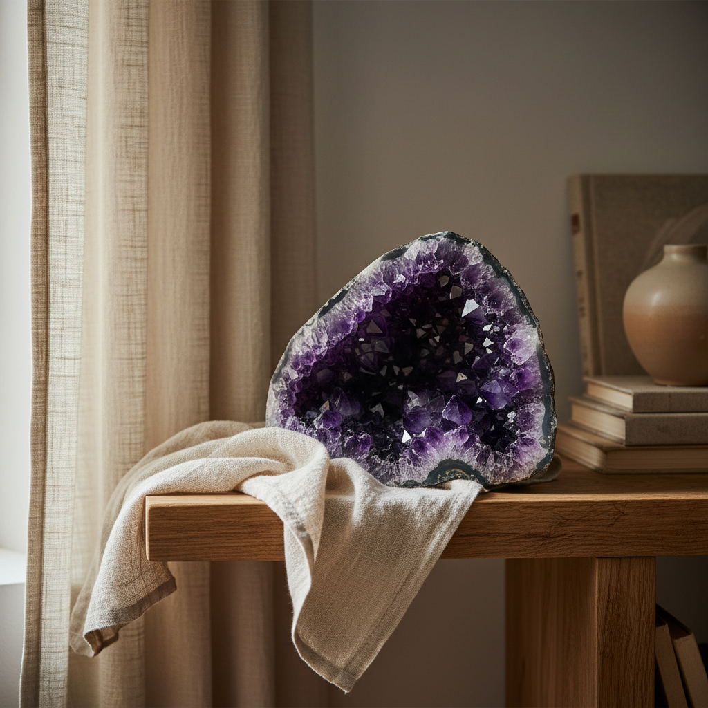 | Géode médiane | 180–600 € | Base stable, densité des cristaux | Vérifier l’équilibre sur meuble |