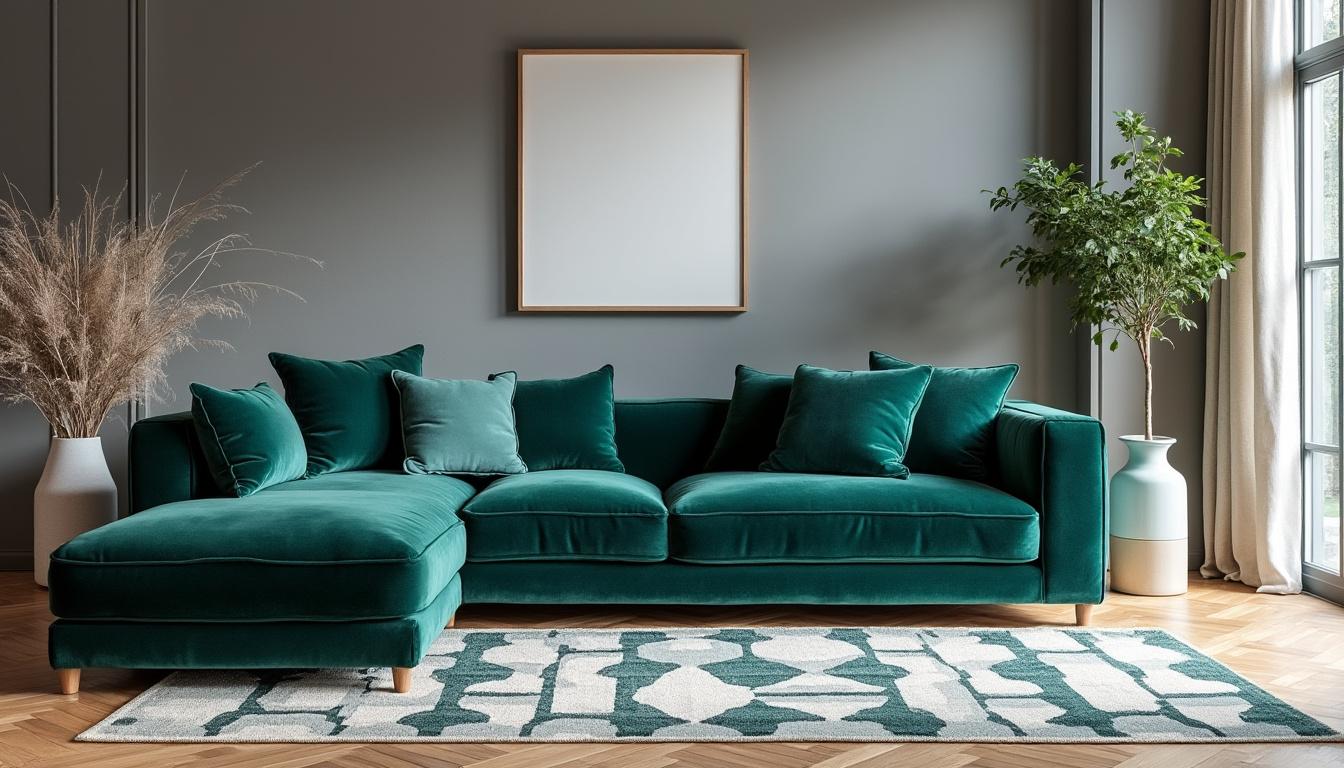 | Mobilier en velours vert canard | Texture riche et élégante | Entretien délicat selon les matériaux | Bois naturel, métal noir |